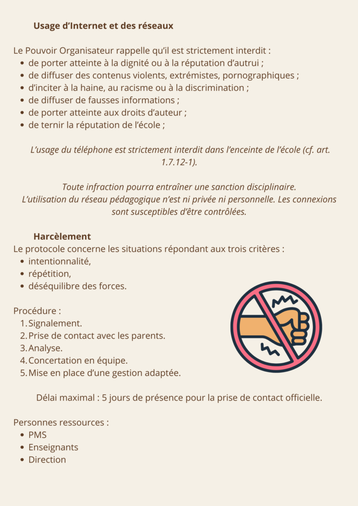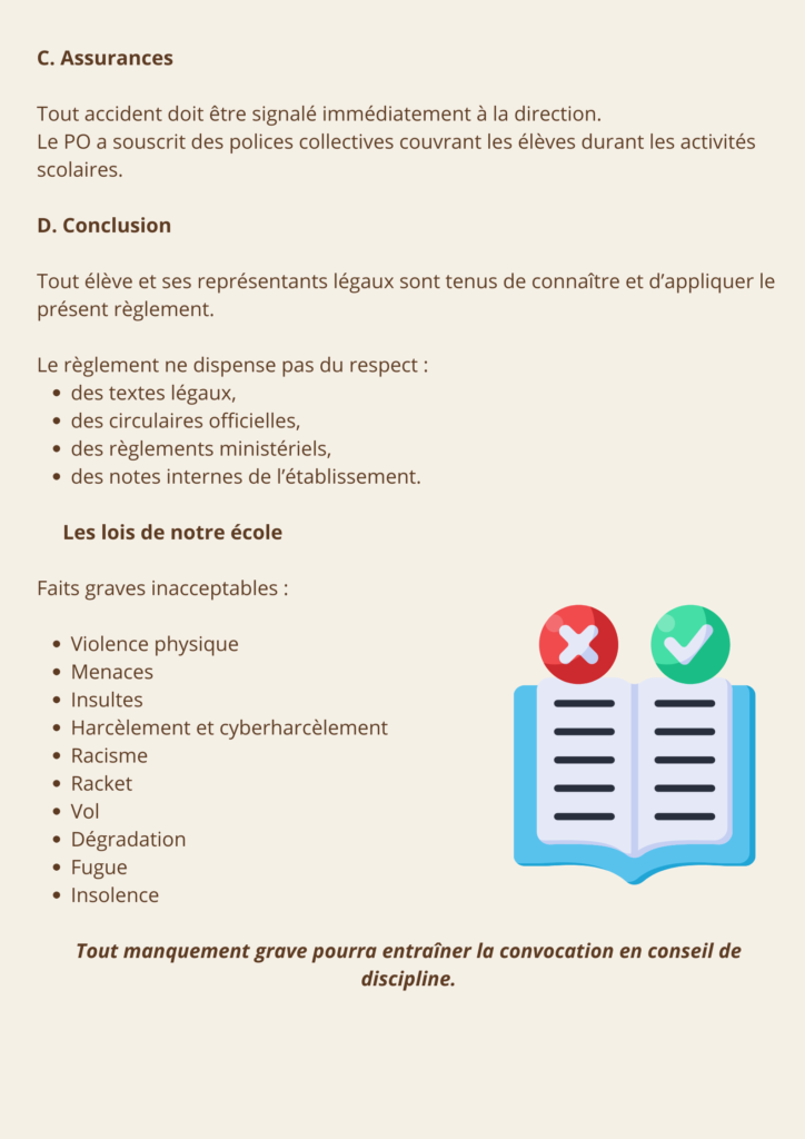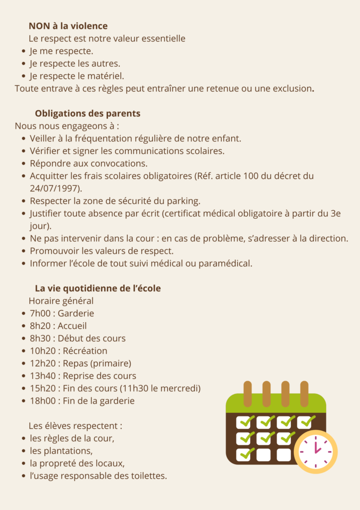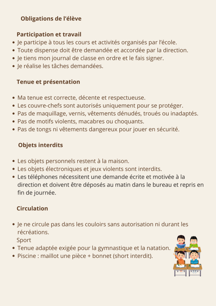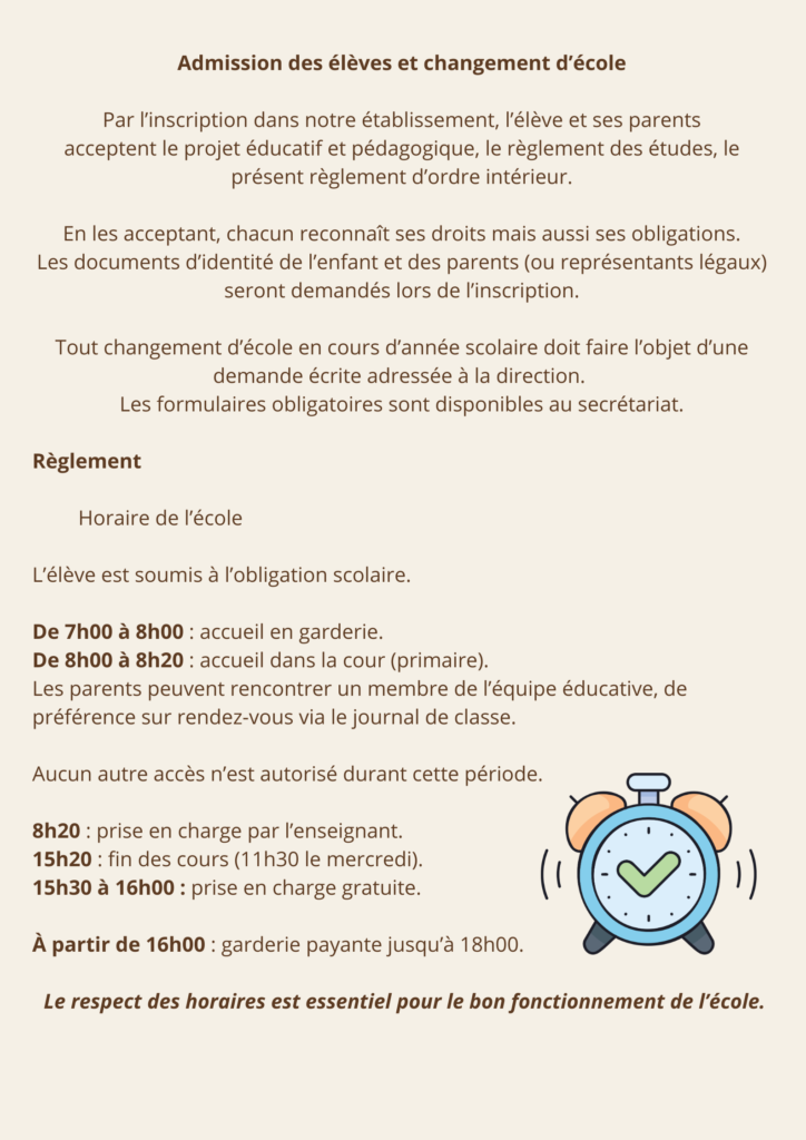 Ce règlement aborde notamment la ponctualité, l’assiduité, le respect des autres, le comportement à adopter, ainsi que les procédures en cas de manquement. Il veille aussi à rappeler les valeurs partagées au sein de notre école, comme le respect, la bienveillance et la solidarité.